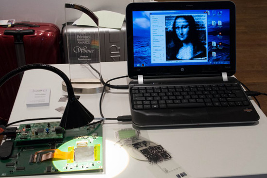 說到具備閱讀能力的顯示屏,上圖中所展示的技術也具備這種能力。雖然它對比柔性圖像傳感器可能顯得不那么高科技,但也算非常有趣。這項技術名為Touchcode,來自于一家名為T+Ink的公司,他們的目標是使用自己的技術在某些應用領域取代相對昂貴的RFID技術。使用RFID技術時,你需要把電子元件嵌入到公交卡或者鑰匙鏈等物品當中。而T+Ink的技術只需要導電墨水即可,很顯然,他們的技術能夠以一種更為廉價、輕薄和柔性的方式將信息傳輸到閱讀器當中。